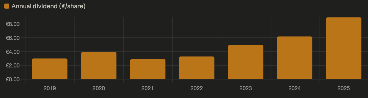 Dividend policy: 80% payout ratio consistently maintained and growing, with FY 2025 dividend of €8.94 per share (a record) representing a new high each successive year.