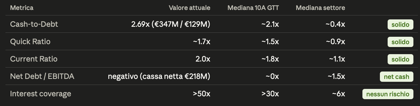 Il bilancio di GTT è snello e pulito, riflettendo il modello royalty asset-light: €347M di cassa, ~€120M di debito, posizione netta positiva di ~€227M. Nessun inventario (GTT non produce beni fisici), ricavi differiti significativi (la cassa viene incassata dai cantieri in anticipo rispetto al riconoscimento dei ricavi), capitale circolante leggermente negativo su base normalizzata (favorevole).
