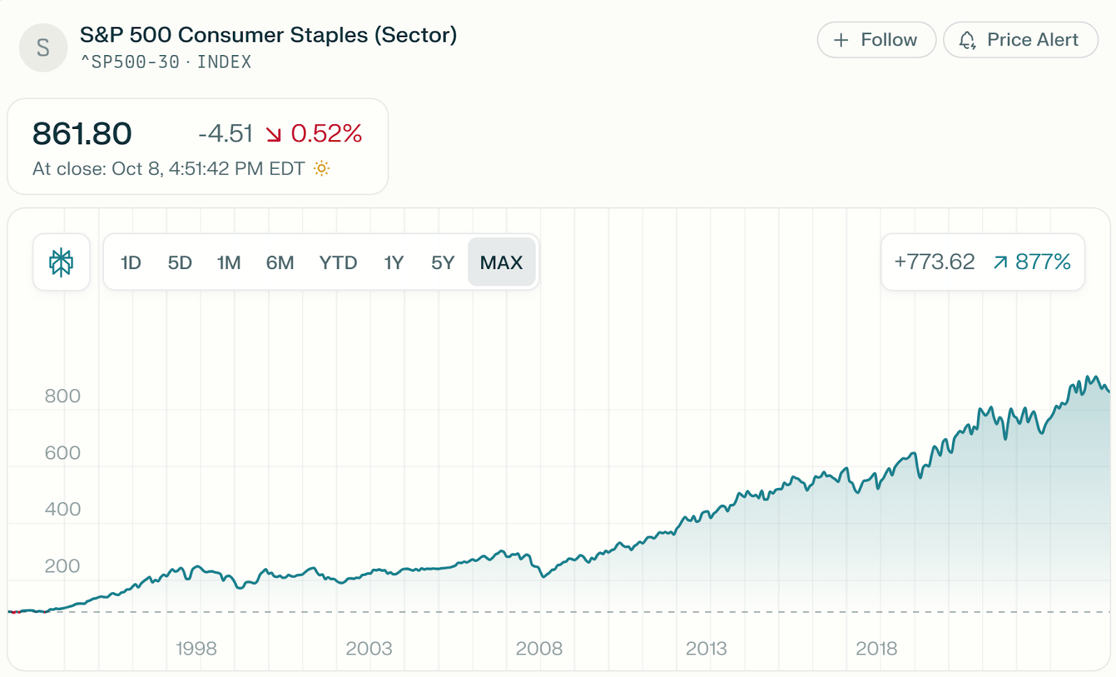 Guardando ai dati di mercato a più lungo termine, i titoli azionari dei beni di consumo di base hanno dimostrato sia resilienza che una crescita costante. Negli ultimi 30 anni, l'indice MSCI World Consumer Staples ha generato un rendimento totale annualizzato dell'8-9% circa, leggermente inferiore all'indice MSCI World più ampio nei mercati rialzisti forti, ma con cali molto più contenuti durante le fasi di ribasso, mentre l'indice S&P 500 Consumer Staples ha registrato un rendimento annualizzato del 9-10%, leggermente inferiore al 10-11% del mercato più ampio, ma anche con una volatilità molto più bassa.